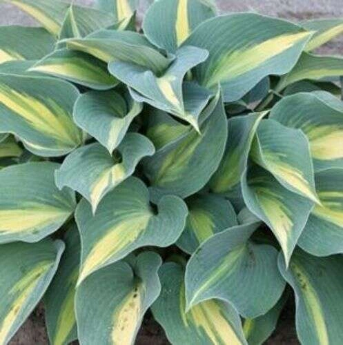Liście są zielone z jasnym, kremowym marginesem, wyraźnie odcinającym się od centrum blaszki. Mają klasyczny, lekko sercowaty kształt i gładką powierzchnię, a rysunek liścia pozostaje czytelny przez cały sezon.
