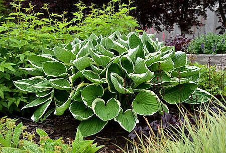 W cienistych rabatach, gdzie potrzebne są odmiany o wyraźnym kontraście barw liści i większej skali wzrostu, dobrze sprawdzają się funkie z jasnym marginesem.